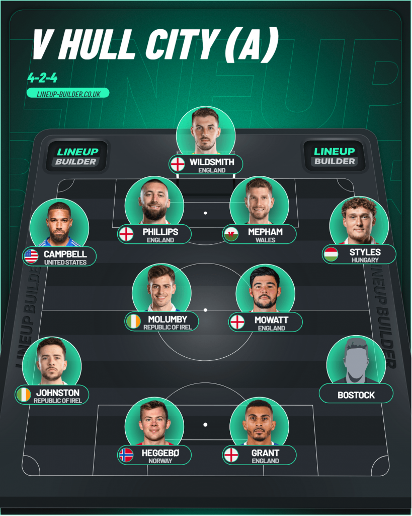 Line up over Hull City, Wildsmith would come into goal, in the back I have Nat Phillips and Chris Mepham and wing backs George Campbell and Callum Styles would retain their place in the line-up.