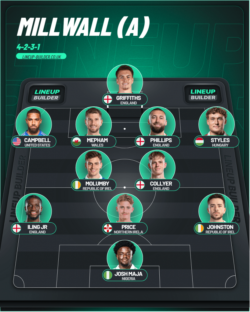 The line up for Millwall, I go for it might not be the line up Ryan Mason would make on Saturday but this is what I’d go for, I have Josh Griffiths in goal and should be our number 1 keeper for the season, in the back four I bring Styles back in for Charlie Taylor.