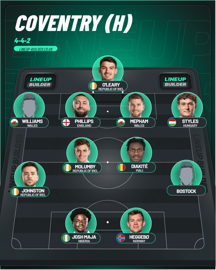 In midfield Jayson Molumby and Ousmane Diakité would play in the centre with Mikey Johnston and Ollie Bostock getting his first league start with a front two of Aune Heggebo and Josh Maja into the side after his goal over Norwich in the Cup.